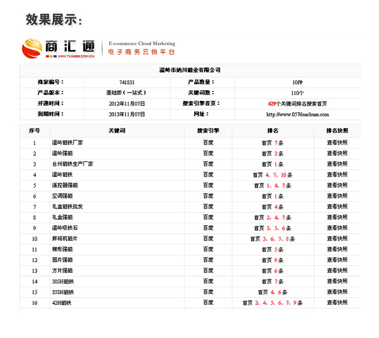 答:因為一些行業(yè)和關鍵詞的熱度原因,每個客戶使用商匯通上詞的量和時間都有所差別。如果你的詞如果在推廣后效果不是很明顯,我們客服會根據行業(yè)特點進行調整。我們會保證80%的產品信息上到各大搜索引擎首頁。